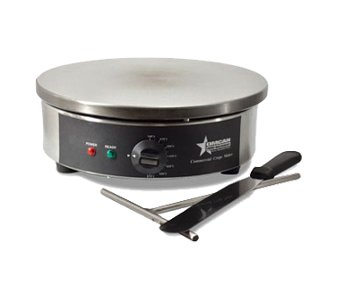 (CE-CN-0350) Crepe Griddle, electric, 14" polished cast iron plate, 140°F (60°C) to 570°F (300°C) temperature range, thermostatic controls, side handles, includes stainless steel spatula, polished cast iron cook plate with stainless steel base, rubber feet 1800 watts, 120v/60/1-ph