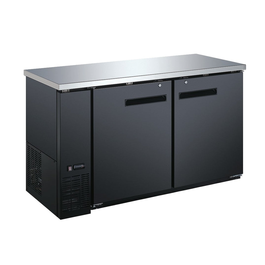 (BB-CN-0016-SH) Refrigerated Back Bar Cooler, reach-in, two-section, side mount self-contained refrigeration, 60.8"W, 33°F to 41°F (0.5°C to 5°C) temperature range, 15.8 cu. ft., electronic control system, (2) solid doors, (4) shelves, stainless steel counter top, interior floor & side, black coating paint exterior, R290 Hydrocarbon refrigerant, R290 Hydrocarbon refrigerant, 150kW, 1/5 HP, 115v/60/1-ph, 2.88 amps, cord, NEMA 5-15P, cETLus, ETL-Sanitation (shipped on pallet)