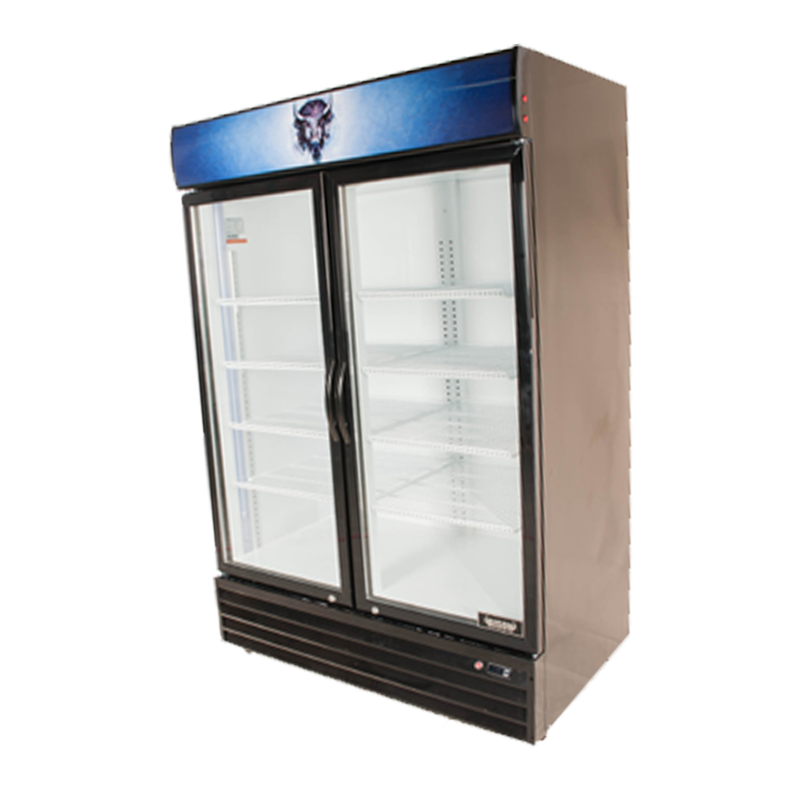 Bison BGM-49 Reach-In Glass Door Refrigerator, two-section, 48 cu. ft., bottom mounted self-contained refrigeration, (2) self closing anti-fog glass doors, (8) adjustable plastic coated steel shelves, digital temperature control, LED lighting, black exterior, white aluminum interior, (4) casters (2 front locking), R290 Hydrocarbon refrigerant, 1/3 HP, 115v/60/1, NEMA 5-15P, cETLus, NSF