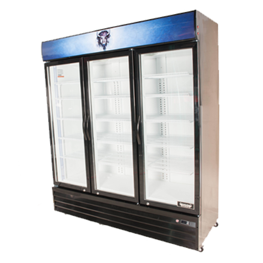 Bison BGM-53 Reach-In Glass Door Refrigerator, three-section, 53 cu. ft., bottom mounted self-contained refrigeration, (3) self closing anti-fog glass doors, (15) adjustable plastic coated steel shelves, digital temperature control, LED lighting, black exterior, white aluminum interior, (4) casters (2 front locking), R290 Hydrocarbon refrigerant, 3/4 HP, 115v/60/1, NEMA 5-15P, cETLus, NSF