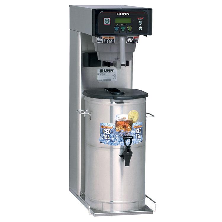 41400.0000 Infusion Series® Iced Tea Brewer, 3 or 5 gallon capacity single brewer ( brews 16.3 to 26.7 gallon/hr), 29" trunk, 3 recipe buttons, digital temperature control, brew counter, pulse interface, energy-saver mode, English & Spanish alphanumeric & advertising display, includes single button graphic overlay & Quickbrew & SplashGard® funnel, brews into BUNN tea dispensers (except TDS-5), 120v/60/1-ph, 1700w, 14amps, NEMA 5-15P, cord attached, UL, NSF