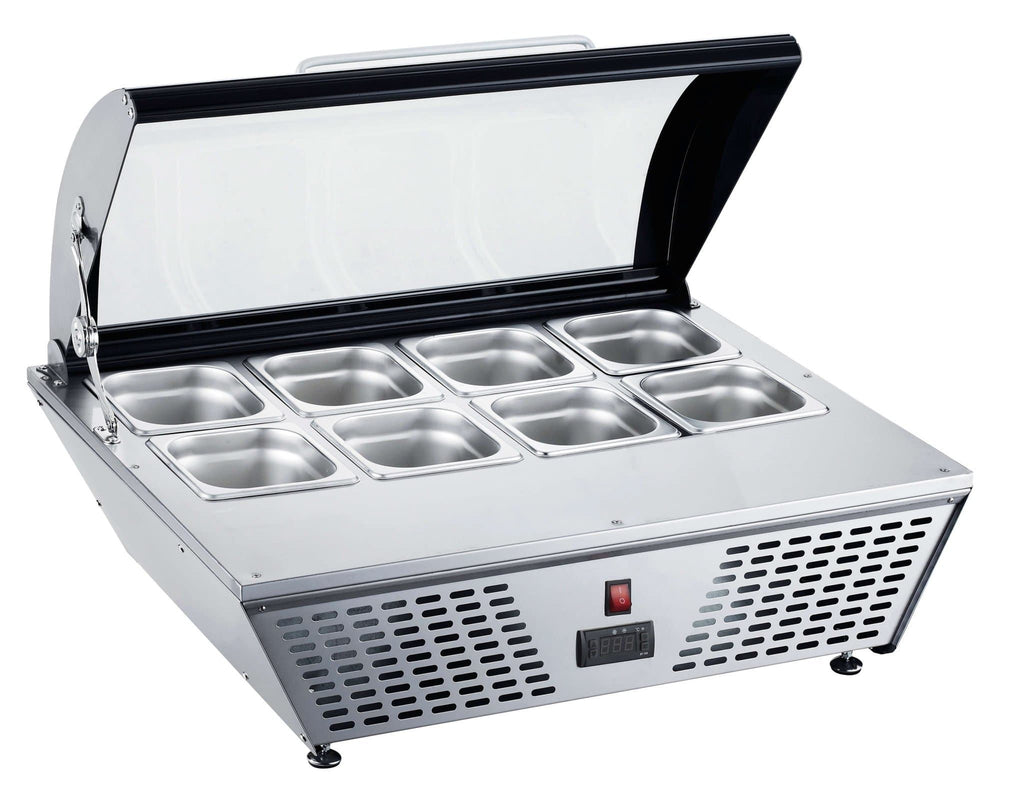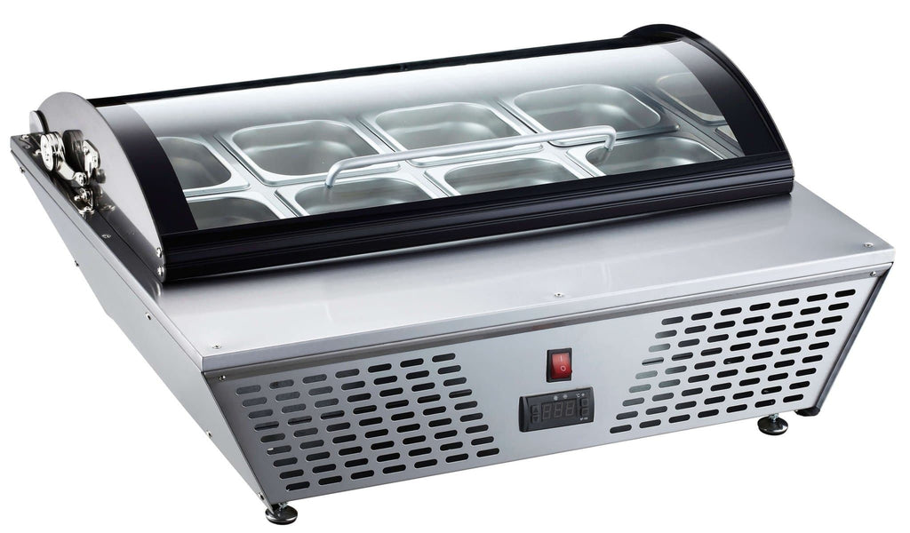 - Includes hydraulic glass door cover that can be lifted to create a sneeze guard