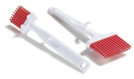 Unique bristle design carries and spreads liquid better than ordinary Silicone pastry brushes. Red color-coding for high heat cooking applications; withstands temperatures up to 500 F. Convenient molded-in hanging hook grabs pan edges to keep brush from sliding in.- Bristle Width: 2 inches.