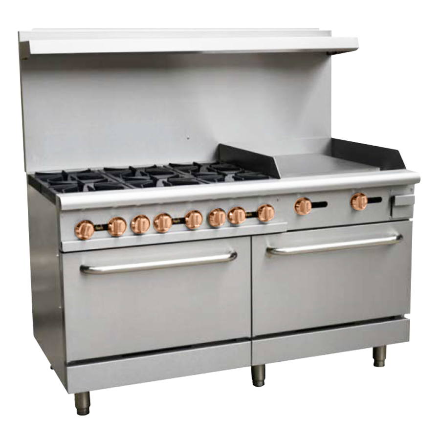 Copper Beech CBR-60-24G Restaurant Range, natural gas, 60"W, (10) 30,000 BTU open burners, cast iron burners & grates, (2) 26.5” standard oven, thermostatically controlled, insulated oven door, (4) racks, U-shaped oven burner, stainless steel front/back riser & galvanized sides, (6) casters, 3/4" NPT rear gas connection, 362,000 BTU, cETLus, ETL-Sanitation