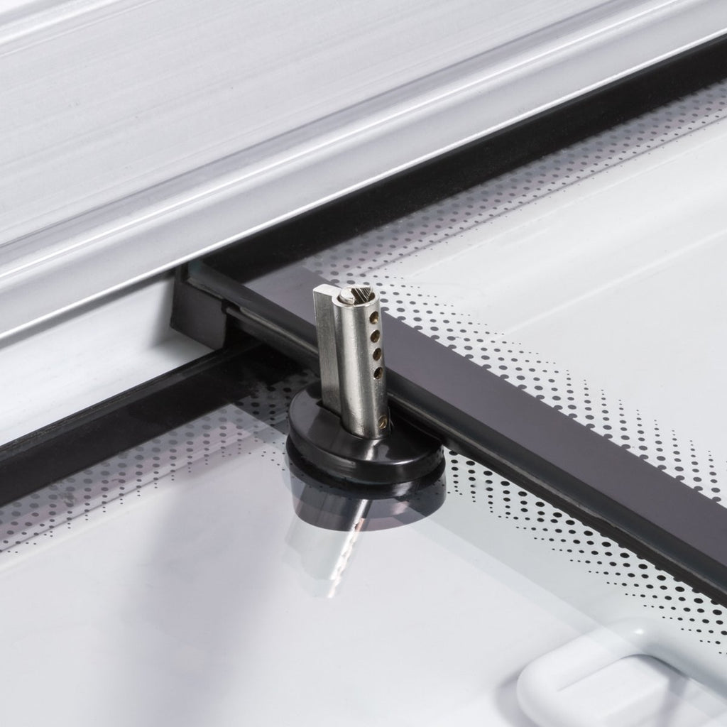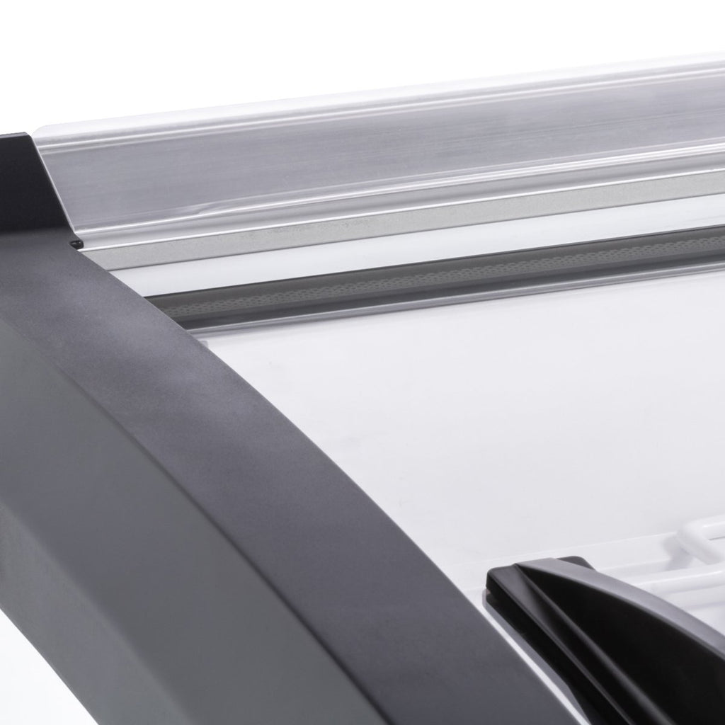 - Clear, curved sliding glass lids and easy grip handle with lock/key
