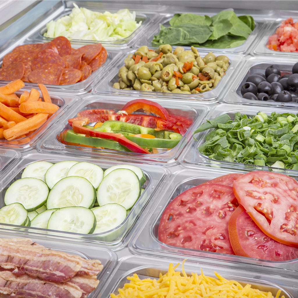 - Equipped with sanitary food grade quality 9" cutting board, full set of divider bars and eighteen (18) 4" deep pans