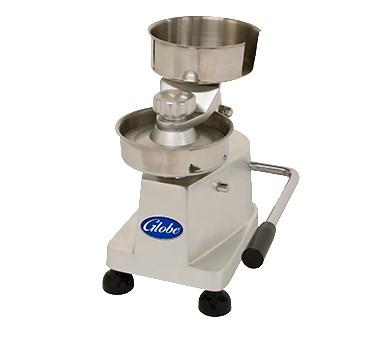 Globe PP5 Patty Press Burger Mold Manual 5" Dia. / 3/4" Thick Patty Anodized Aluminum Base Stainless Steel Bowls And Press Plate Heavy-Duty Single Level Press Handle Detachable Paper Holder Includes Starter Pack Of (500) Paper Dividers 7"W X 11-1/4"D Foot Print NSF