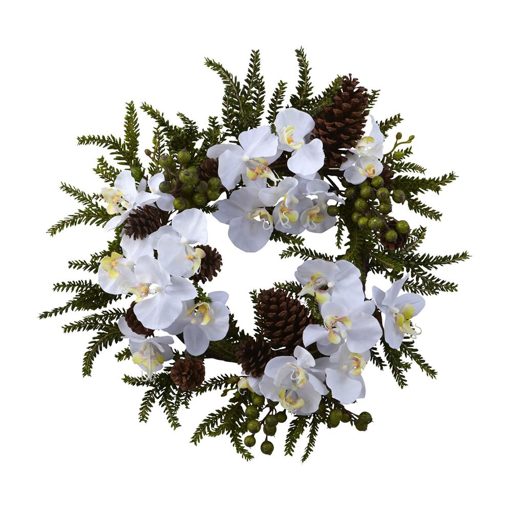 Here's an ideal mix of color, texture, and form. This 22" Phalaenopsis & Pine Wreath is a circle of calm beauty (that also gets a little wild as well.) With beautiful pine fronds, green berries, faux pinecones, and lovely, delicate Phalaenopsis orchid blooms, this wreath will lighten up even the darkest of areas. Makes an extremely thoughtful gift as well.