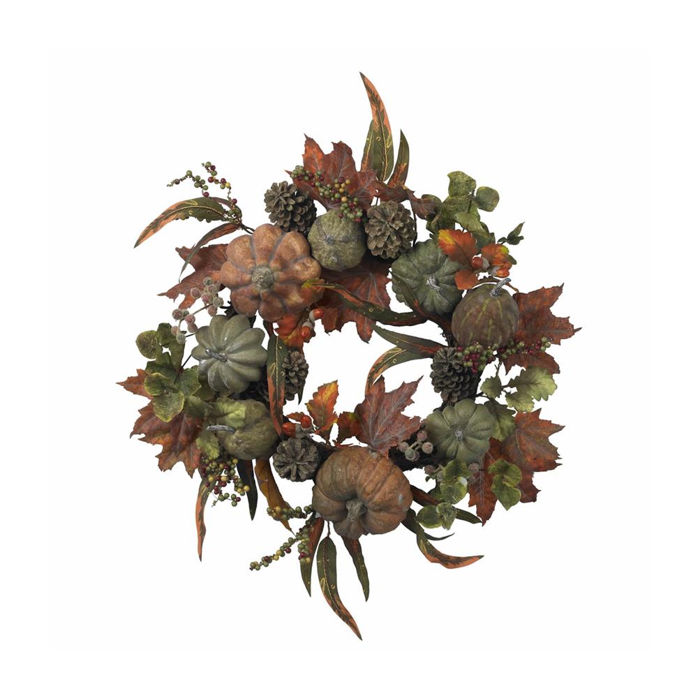 A west-coast twist on a treasured holiday classic, this 24" wreath is bursting with the spoils of a traditional Autumn harvest. With gourds and small pumpkins adorning the multihued "leafs, berries, and twigs" backdrop, this eye-catching offering is perfect for adding that "touch of Fall" to your holiday decor. Plus, it'll stay "fresh" for years to come.