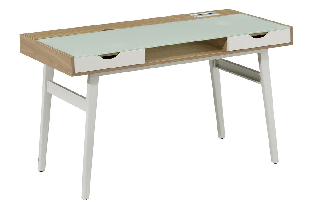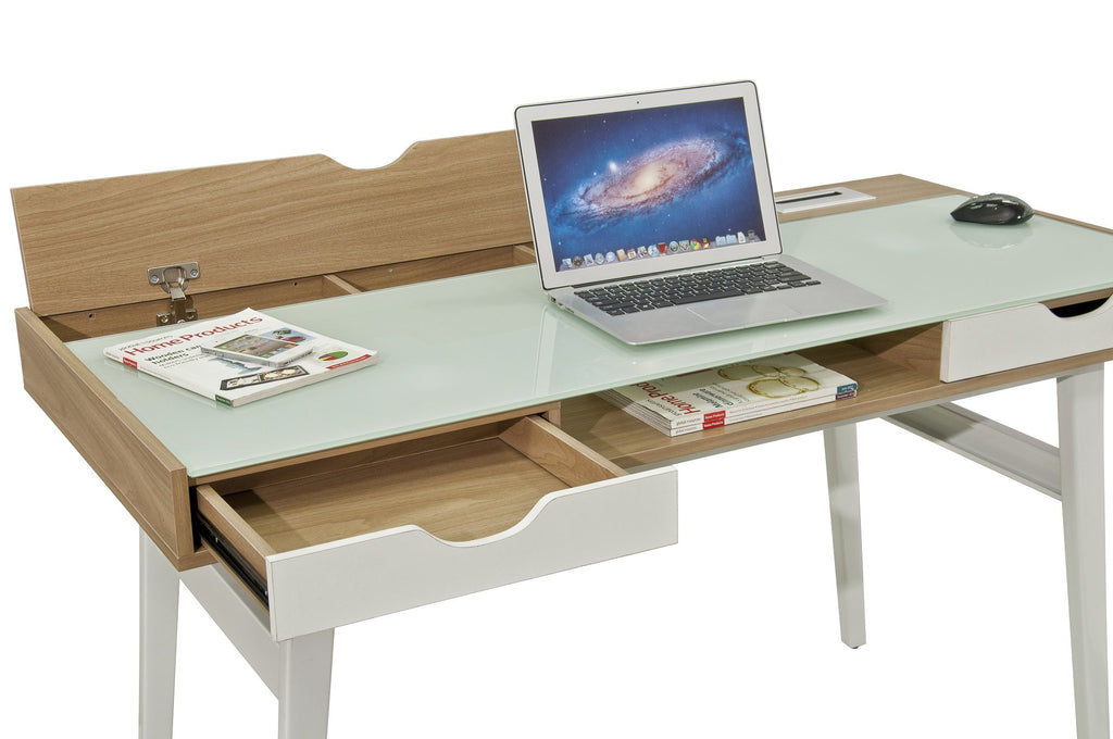 his desk, in all its subtleties, screams smart and stylish. With a contrasting frame and oak-finished desktop, it will be the eye-catching focal point in your office. Its modern charm is complemented further by its functionality: the frosted glass surface provides loads of work area to spread out, and multiple storage compartments and drawers give you plenty of space to keep essentials at-hand but neatly tucked away.