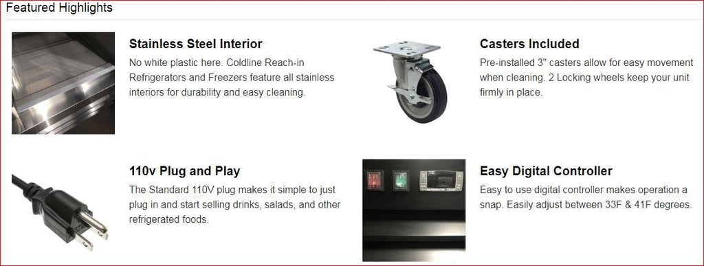 This 54″ Coldline reach-in glass door refrigerator with 47 cubic feet of space is ideal for your commercial kitchen. Coldline refrigerators are equipped with electronic temperature control to keep the product at the perfect refrigeration point. Stainless steel interior and exterior, self-closing doors, and adjustable heavy-duty PVC coated shelves all make this unit a reliable commercial refrigerator for any foodservice locale.